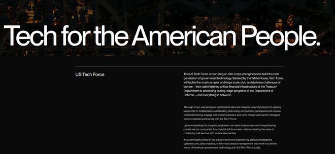 具体来说,美国技术军团正在寻找软件工程、人工智能、网络安全、数据分析或技术项目管理方面的专业人士。他们将致力于高影响力的技术计划,包括实施人工智能、开发应用程序、实现数据现代化以及为联邦机构提供数字服务。